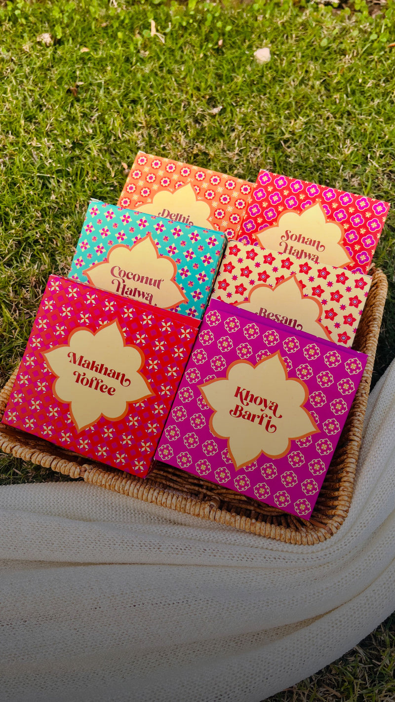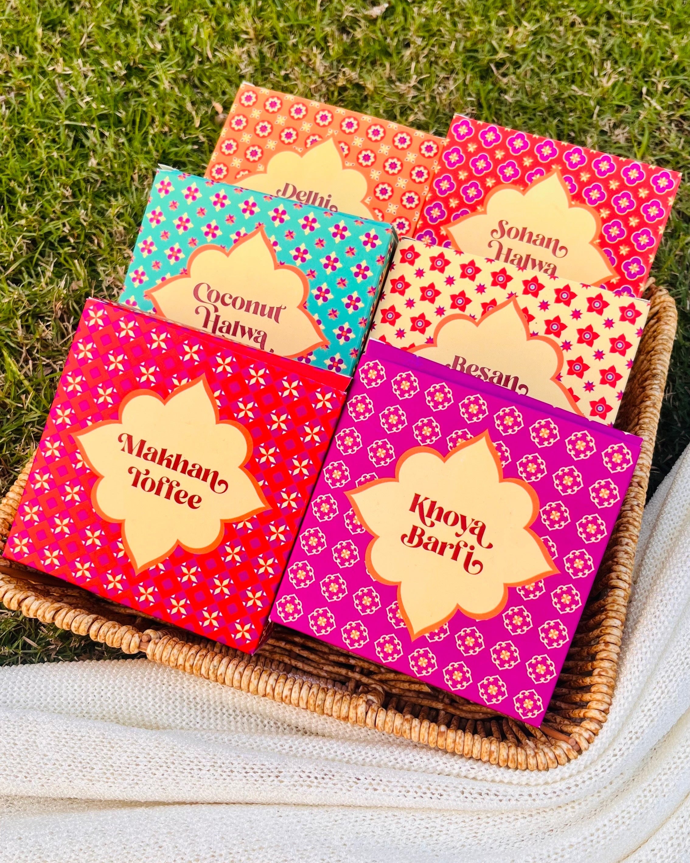 Six of our most loved heritage mithais in 100g each, all made in Desi Ghee. Inside, you’ll find: